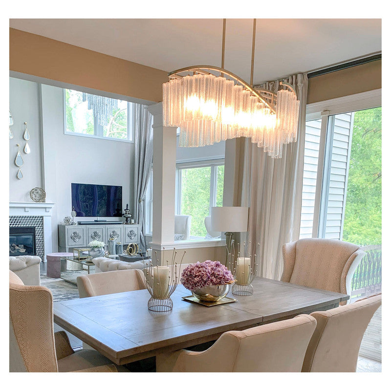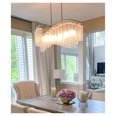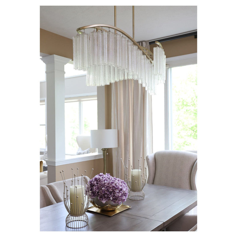 Cascading Waterfall glass shades are suspended from a frame finished in our popular Golden Silver. This elegant collection spans design genres from contemporary to traditional which gives it universal appeal.