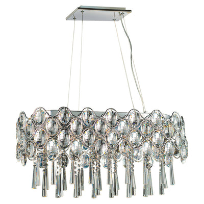 Definitely not your grandmother's crystal, the Jewel Collection transforms an elegant gem into a bold design formed of bent steel, undulating patterns, and a Polished Chrome finish. The substantial Beveled Crystals sparkle like jewel pendants, while the internal crystal beads delicately reflect the light from the xenon lamps included with each fixture.