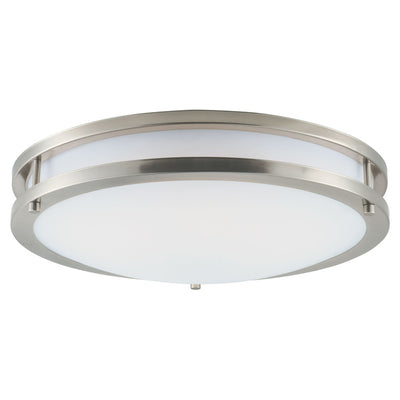 Commercial grade energy efficient lighting featuring linear frames of metal finished in Satin Nickel diffused by an etched opal acrylic creating an updated energy efficient classic.