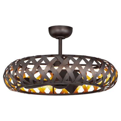 Bands of metal are woven on a frame and finished in Bronze Gilt on the outside and a contrasting Gold Leaf finish on the inside. An LED light source peers through openings in the weave and directs light outward eliminating any strobing effect that fans may cause. This Fandelight has been updated with a Wi-Fi enabled control that operates color temperature, light intensity and the fan speed. These features can be adjusted by either the remote provided or Smart Home apps.