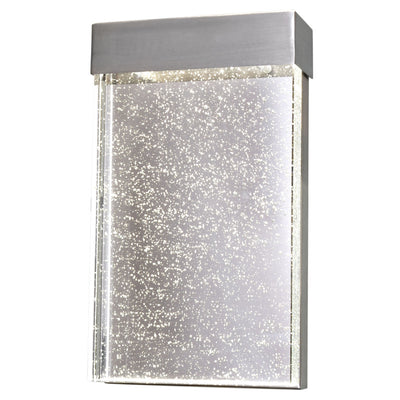 Solid blocks of glass infused with tiny bubbles come to life when illuminated by high power LEDs concealed in the frame above. Frames are constructed of Stainless Steel and are also available in Bronze.