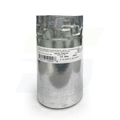 The outer wall is constructed of galvanized steel, .018" thick G-90 for sizes 3" to 14" diameter, and .024" thick G-90 for sizes 16" to 30" diameter. The inner wall is constructed of aluminum alloy, .012" thick for sizes 3" to 8" diameter and .018" thick for sizes 10" to 30" diameter. The vent includes an integral, annular insulating air space, ¼" thick for sizes3" to 6" diameter and 1/2" thick for sizes 7" to 30" diameter.
