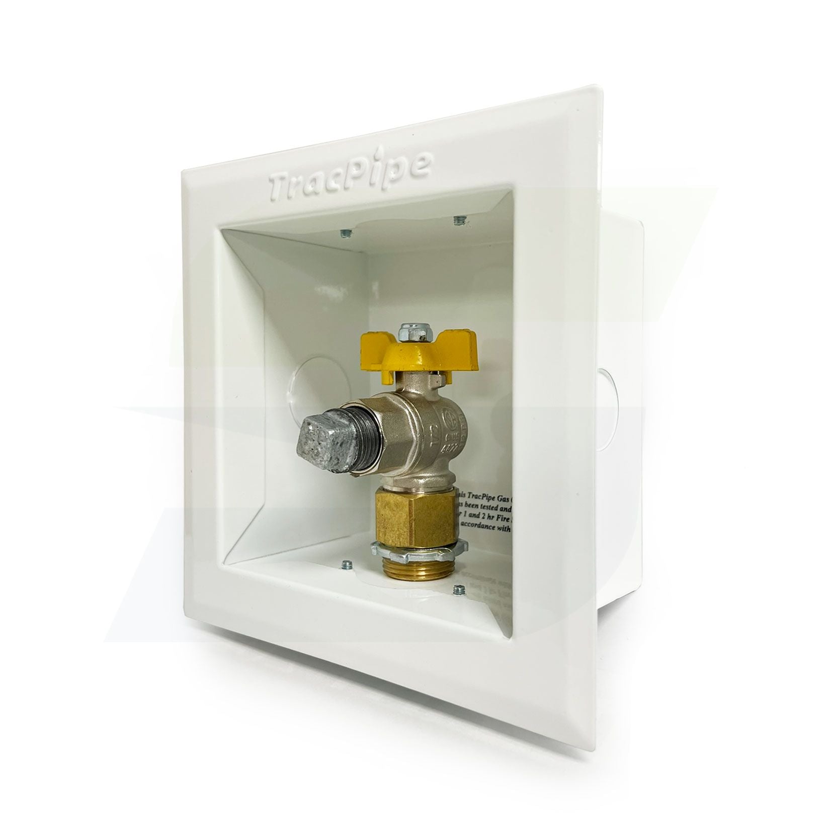 Metal wall box with valve for use with zero clearance appliance installations. Reverse Mounting tabs to accommodate double sheetrock walls. For Indoor Use Only. Wall Box is Fire Rated to UL 1479.
