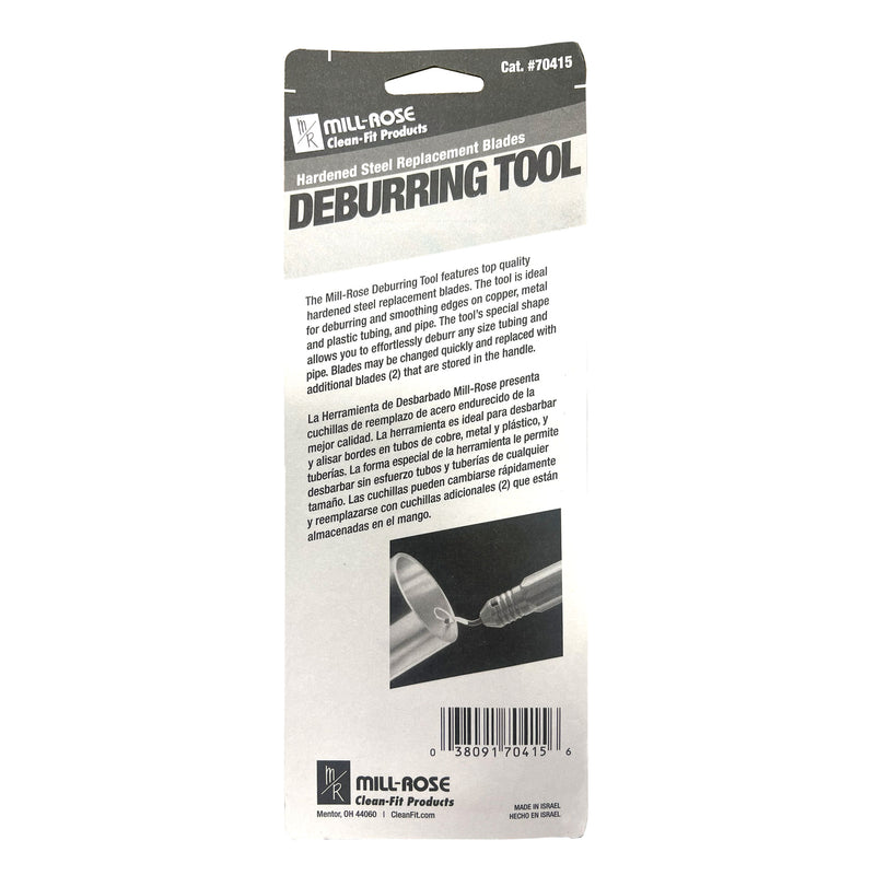 The Mill-Rose Deburring Tool features top quality hardened steel replacement blades. The tool is ideal for deburring and smoothing edges on copper, metal and plastic tubing, and pipe. The tool's special shape allows you to effortlessly deburr any size tubing and pipe. Blades may be changed quickly and replaced with additional blades (2) that are stored in the handle.