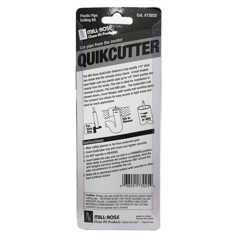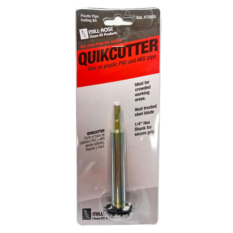 The Mill-Rose QuikCutter features a top-quality 1/4" steel hex shank that fits virtually every chuck. A heat-treated steel blade cuts any plastic pipe up to 1/4" thick quickly and cleanly from the inside. This tool is ideal for installation or removal of plastic, PVC and ABS pipe. The QuikCutter cuts shower drains, closet flanges, bath waste and overflow pipes.