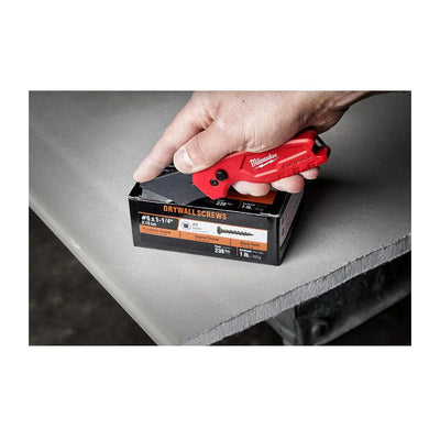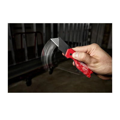 The FASTBACK Compact Folding Utility Knife features a press and flip mechanism for easy, one-handed opening. The MILWAUKEE utility knife allows you to make quick, tool-free blade changes for maximum jobsite efficiency with a metal extension over the button to prevent accidental blade removal. The press and flip-open drywall/utility knife’s compact size allows for easy storage while a durable wire belt clip reduces pocket tearing. The small utility knife has a blade holder designed for scoring. The compact folding knife also includes a lanyard hole for convenient tethering.