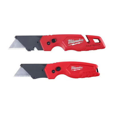 The FASTBACK Folding Utility Knife Set includes the FASTBACK™ Folding Utility Knife with Blade Storage and the FASTBACK Compact Folding Utility Knife. Both MILWAUKEE knives feature a press and flip mechanism for easy, one-handed opening. The utility knives allow users to make quick, tool-free blade changes for maximum efficiency with a metal extension over the button prevents accidental blade removal. Both press and flip-open utility knives have a durable wire belt clip to reduce pocket tearing. The FASTBACK Folding Utility Knife with Blade Storage has an integrated gut hook and wire stripper for increased versatility. The metal body on the FASTBACK Folding Utility Knife w/ Blade Storage provides durability and the onboard blade storage allows users to store 5 extra blades. The small utility knife is compact for easy storage.
