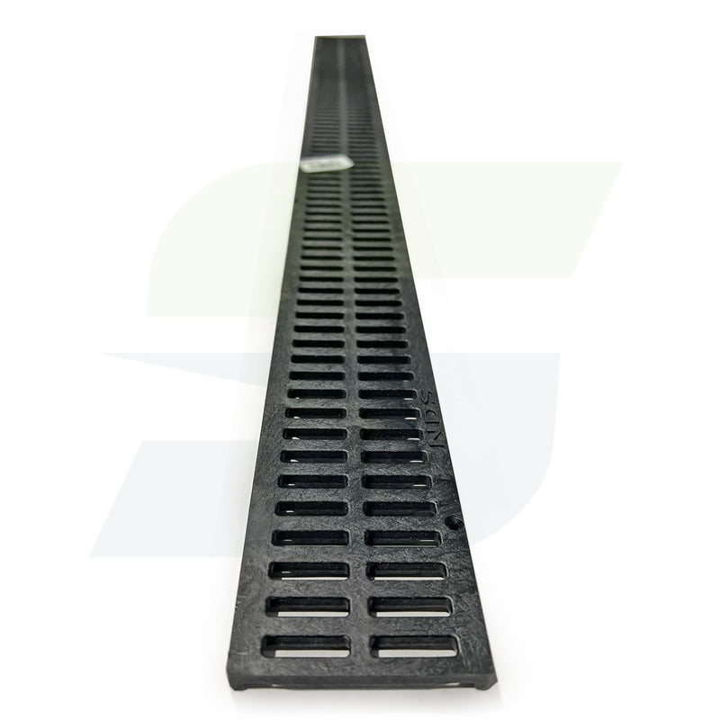 The NDS Mini Channel Drain 3' Channel Grate in black is a durable, UV-stabilized polypropylene grate designed for use with the NDS Mini Channel Drain system. It provides reliable surface water drainage while keeping out leaves, debris, and other blockages. Lightweight yet strong, this grate is ADA-compliant, heel-proof, and suitable for residential or light commercial applications.