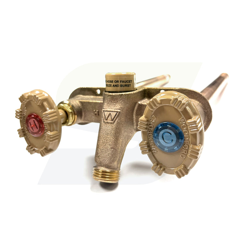 The Freezeless Model 22 hot and cold faucet is designed and intended for year-round hot and cold irrigation and cleaning purposes regardless of outside temperature. Separate hot and cold inlet tubes allow for manually operated temperature control with cross contamination protection. This faucet contains patented pressure relief valves that prevents the faucet from bursting in freezing weather should a hose be accidentally left on. The Model 22 contains an integral backflow protection device and does not require an add-on vacuum breaker. This ASSE 1019 device in intended for irrigation use and outdoor watering and shall not be subjected to more than (12) hours of continuous water pressure.