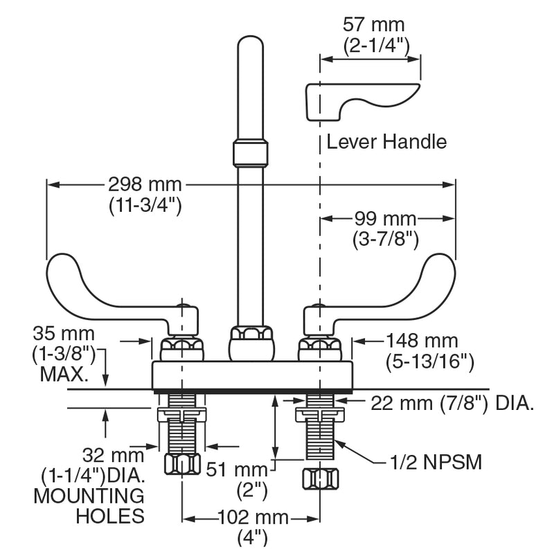 Durable cast brass construction. 1/2" male threaded inlet shanks with shank nuts and brass coupling nuts. 1/4 turn ceramic disc valve cartridges. Field-convertible swivel/rigid spout. Choice of Vandal-Resistant Wrist Blade or Lever handles with blue & red color indexes. All brass drain body with 1 1/4" (32mm) tailpiece (on applicable models). 1.5 gpm/5.7L/min. maximum flow rate.