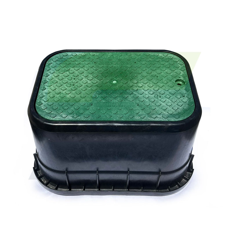 The Rain Bird PVBSTD Standard Valve Box is a reliable solution for housing and protecting irrigation valves and system components. Designed with a durable black polyethylene body and a drop-in green lid, this valve box blends strength with accessibility. It's ideal for both residential and light commercial irrigation setups, offering quick access and long-lasting protection.