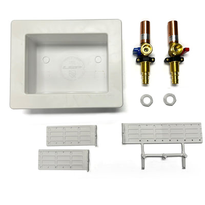 All of the great features of our Ice Maker One Stop Box with Hammer Arrester valve. Rough-in Kit (-RK) includes box, valves and debris cover.