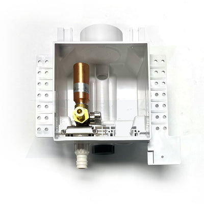 All of the great features of our Ice Maker One Stop Box with Hammer Arrester valve. Rough-in Kit (-RK) includes box, valves and debris cover.