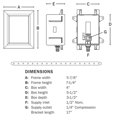 Sioux Chief 696 series OxBox outlet box shall be used where necessary in plumbing systems. Unit shall allow for mounting with supply lines from top or bottom, on-stud or between-studs. Unit shall include plated, 1/4-turn valve with 1/4" compression outlet. Valve outlets shall be provided with tamper resistant test caps. Metal support bracket can be installed into tracks of box. Designed in accordance with IAPMO PS 54-2021a.