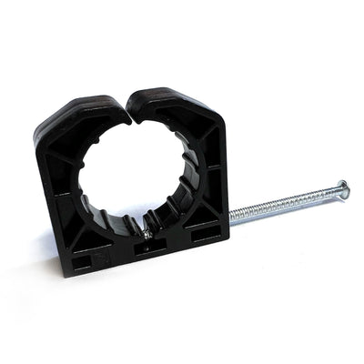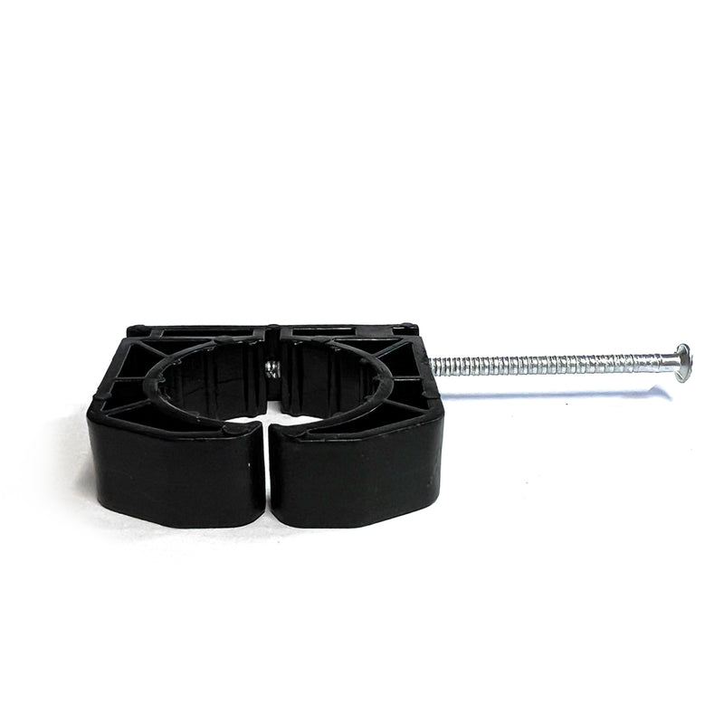 Constructed of high-impact plastic. Fast and easy to use. Pre-installed barbed nail prevents backout. Isolates tube from surface to reduce noise and protect tube from errant nails. Black in color.