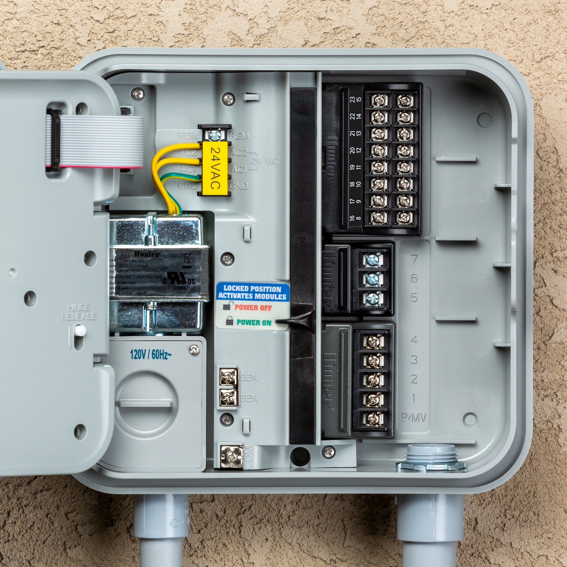The Pro-C controller is supplied with a factory-installed base module for up to 4 stations. Additional modules may be added in increments of 3 stations (PCM-300), 9 stations (PCM-900), or 16 stations (PCM-1600). In total, a conventionally wired system can be expanded up to 23 stations