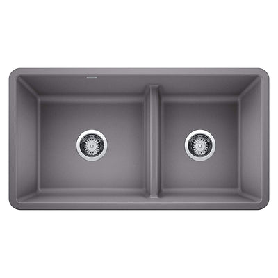 The BLANCO PRECIS SILGRANIT REVERSIBLE 33" 60/40 DOUBLE BOWL KITCHEN SINK WITH LOW DIVIDE is inspired by professional kitchen sinks in both form and functionality. With crisp angular shaping and simple but spacious design, this kitchen sink easily conquers the demands of everyday life. Featuring a functional low divide, the sink conveniently accommodates large pots, while keeping cleaning and prep separate. The sink's reversible design also makes any kitchen sink specification easy to achieve. Made from the rock hard, durable SILGRANIT patented surface, it's no wonder this hardworking granite composite sink collection is one of our most popular. Beautiful and highly functional, the PRECIS kitchen sink features a smooth surface that is resistant to chips, scratches and heats up to 536°F. Even a fork or the bottom of a hot pan can't damage BLANCO SILGRANIT sinks. The colorful, non-porous surface also makes the bowl resistant from all stains, household acids and alkali solutions as well as easy-to-clean.