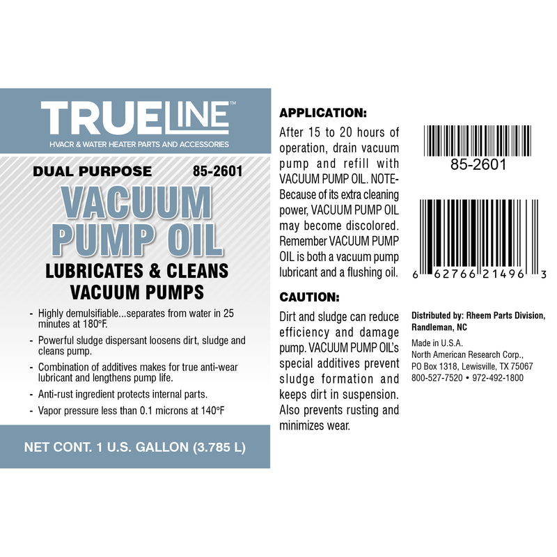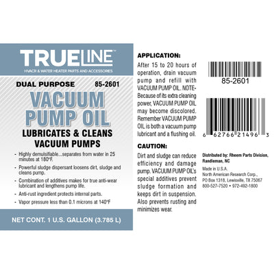 The TrueLine Dual Purpose Vacuum Pump Oil lubricates and cleans the pumping apparatus while also collecting moisture and contaminates from evacuated systems to keep your vacuum running longer. Please read directions carefully before use.