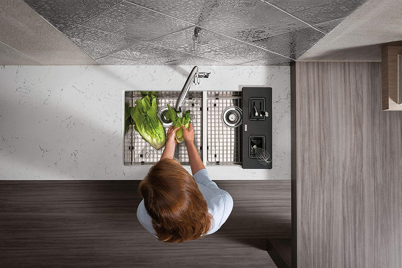 - OPTIONAL ACCESSORIES: Left grid (item #223190), right grid (item #223189), workstation (Item #441741), cutting board (item #231609), colander (item #224387), glass cutting board (item #224390) and sink caddies (item #230694/230422)