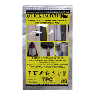 A one-of-a-kind unique product, Quick Patch comes out of the package as pliable as a Band-Aid. Ten minutes later with UV light it transforms into a hard patch that you can sand, paint or drill. The many uses you’ll find for this patch will save you time and money on many of your normally costly equipment repairs and fixes.