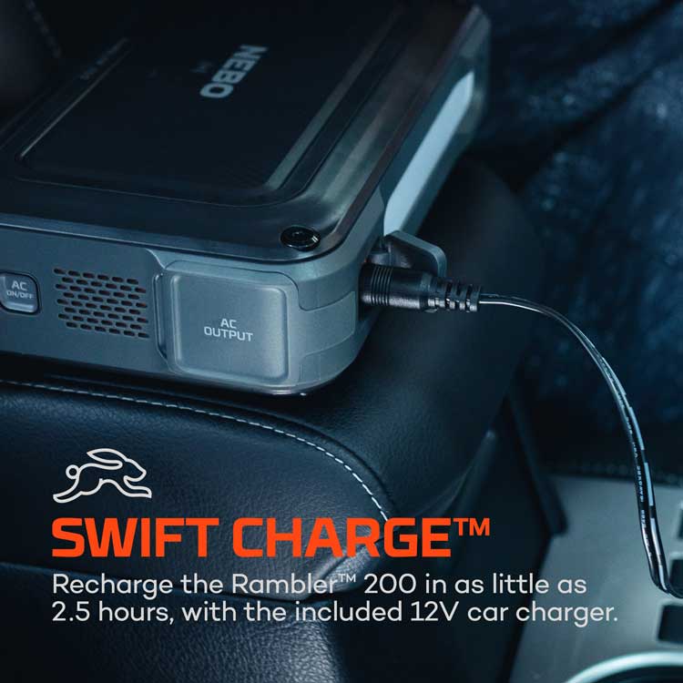 The RAMBLER 200 Power Station is truly meant to roam with its compact, lightweight, and powerful design. At just 5 lb with a powerful 230.4 watt-hour capacity, the RAMBLER 200 is nearly 2.5 times more powerful than the RAMBLER 100 and represents the most compact form factor in its class. The bulk, size and weight of other power stations can make them inconvenient or unpractical to carry in a backpack, but this is where the RAMBLER 200 excels. Start by acquiring power at home, in your car or from the sun with the solar-ready design (solar panel sold separately). Once it’s charged up, you’ll have the confidence and versatility to power just about anything thanks to the six-way output via the dual USB-A ports, USB-C Power Delivery (PD) port, wireless charging pad, 200W AC and DC charging ports. Built with a rugged, impact-resistant body that is stylish enough to be a companion to power your laptop or smartphone at the coffee shop and durable enough to keep up with the demands of the trail or campsite to power your lantern, headlamp, flashlight, or drone. The RAMBLER was designed with recessed, sturdy port covers to protect them from dust or debris to prolong the lifespan of the unit. The 200W AC inverter means that you’ll always have an outlet available so you can work remotely off-grid or power essential devices during a power outage. The color display is easy to read, offering real-time input and output data while the integrated floodlight makes it a great emergency tool.