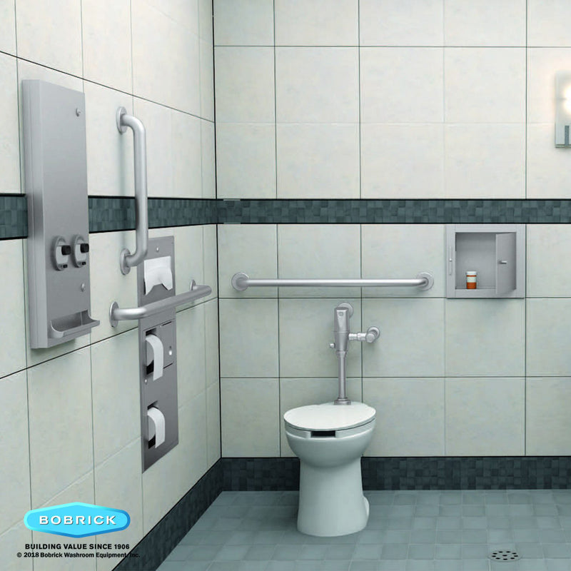 - Recessed B-35745 mounted flush against side wall in accessible toilet compartment has toilet tissue dispenser on left side of unit.