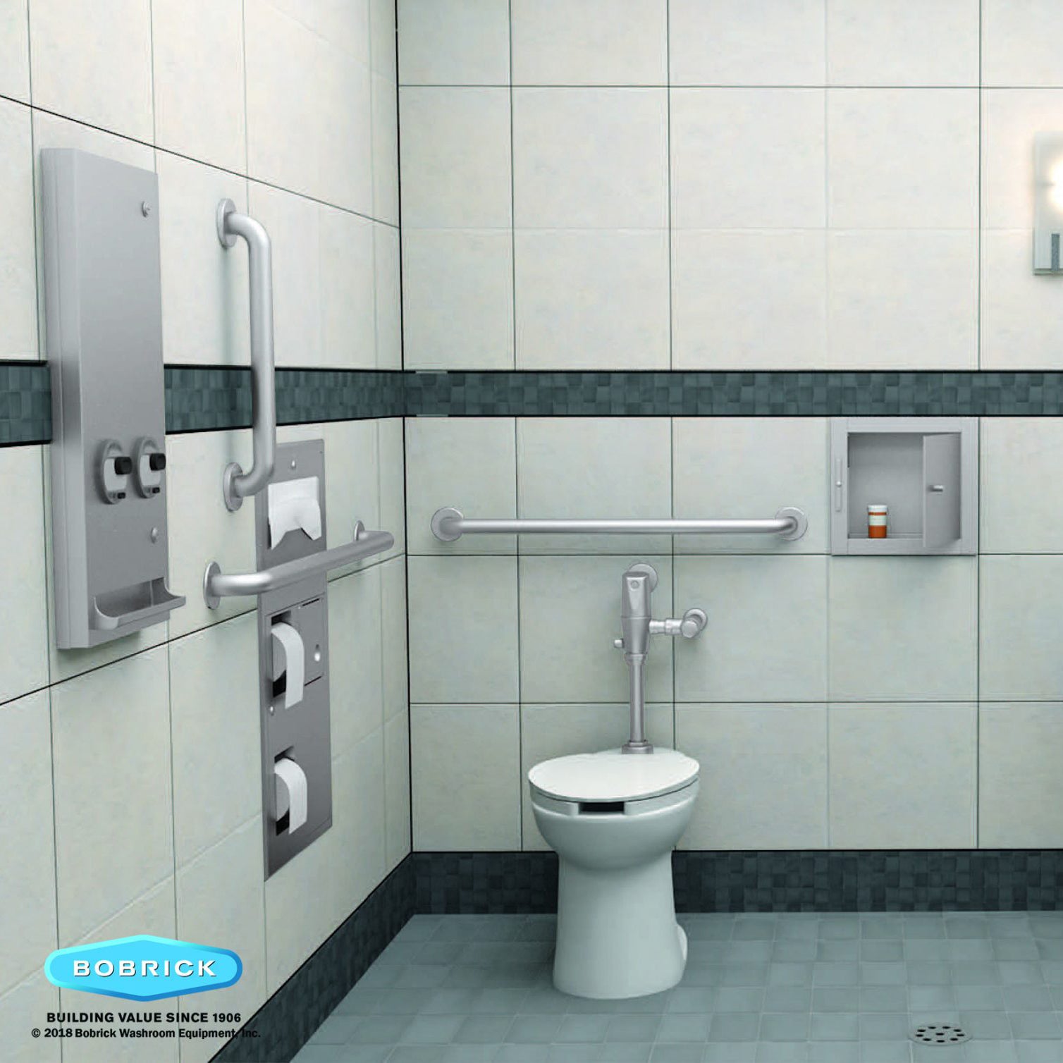 - Mounts centered through toilet partition flush against partition of Accessible Design compartment to allow clearance for grab bar.