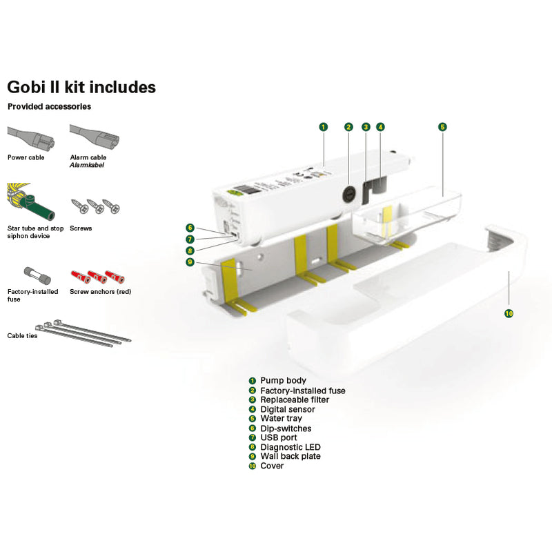 - Includes: Power cable, Alarm cable, Star tube and anti-siphon device, Screws (for mounting), Screw anchors, Factory-installed alarm fuse, Cable ties, Instruction manual