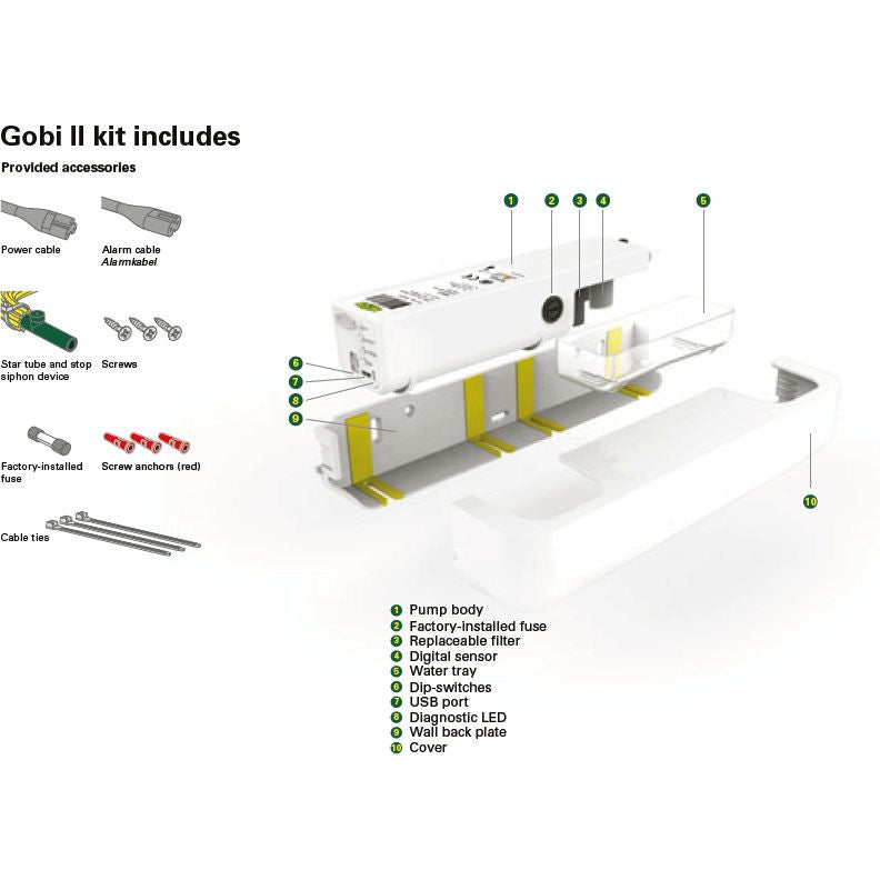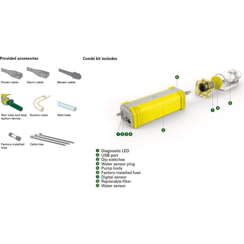- Includes: Power cable, Alarm cable, Sensor cable, Star tube and anti-siphon device, Suction tube, Vent tube, Factory-installed alarm fuse, Cable ties, Instruction manual