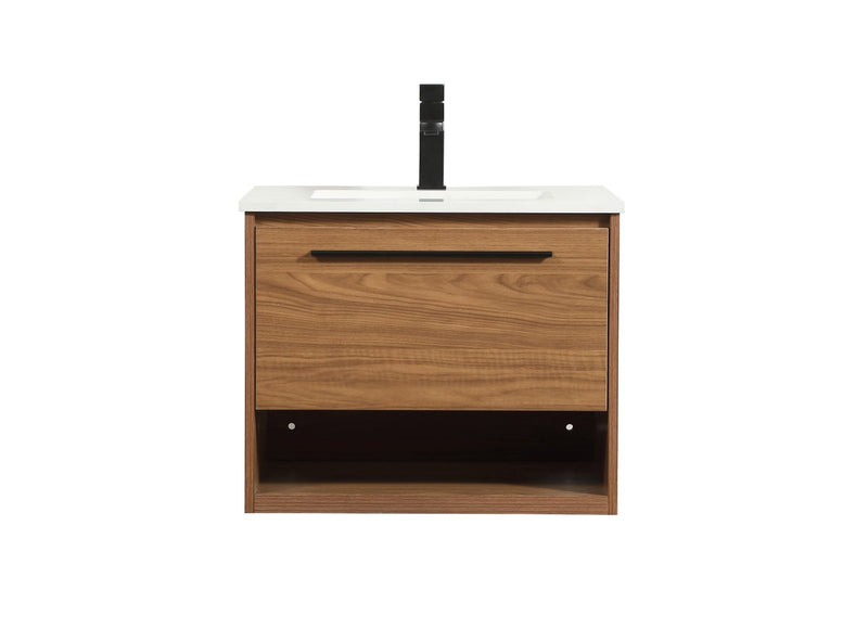 Save space and make your bathroom appear bigger with this floating vanity. Its minimal design will have you in awe, while its clean lines will leave your room feeling fresh and uncluttered. The single u-drawer pulls out for storage while the open space below allows you to place extra towels or various other essentials. The ivory white quartz counter top with porcelain sink adds refined luxe while the aluminum barpull style handle adorn the vanity face.