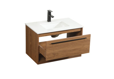 Save space and make your bathroom appear bigger with this floating vanity. Its minimal design will have you in awe, while its clean lines will leave your room feeling fresh and uncluttered. The single u-drawer pulls out for storage while the open space below allows you to place extra towels or various other essentials. The ivory white quartz counter top with porcelain sink adds refined luxe while the aluminum barpull style handle adorn the vanity face.
