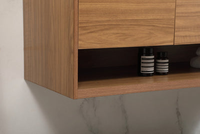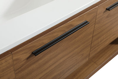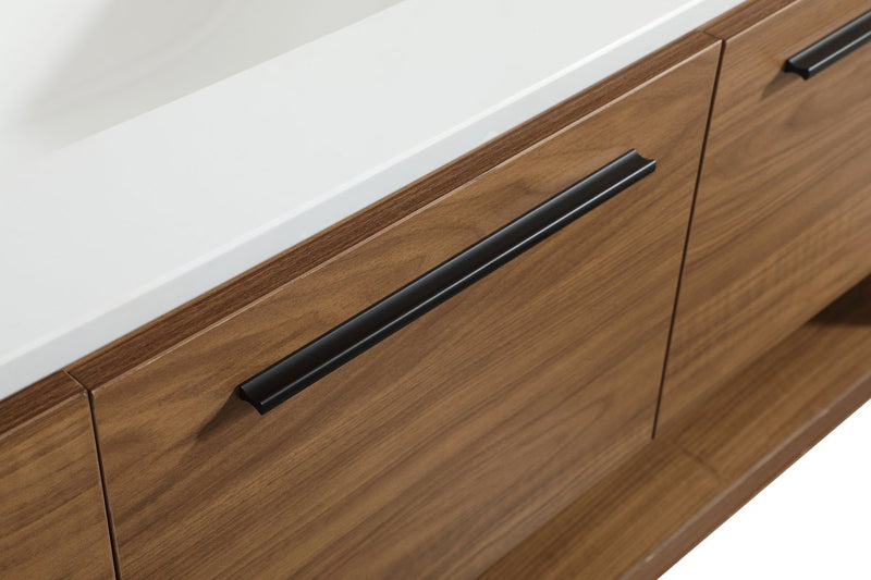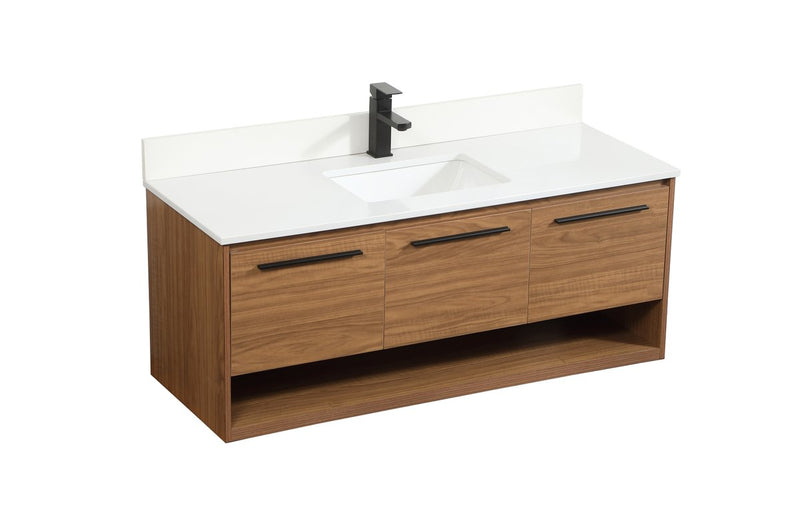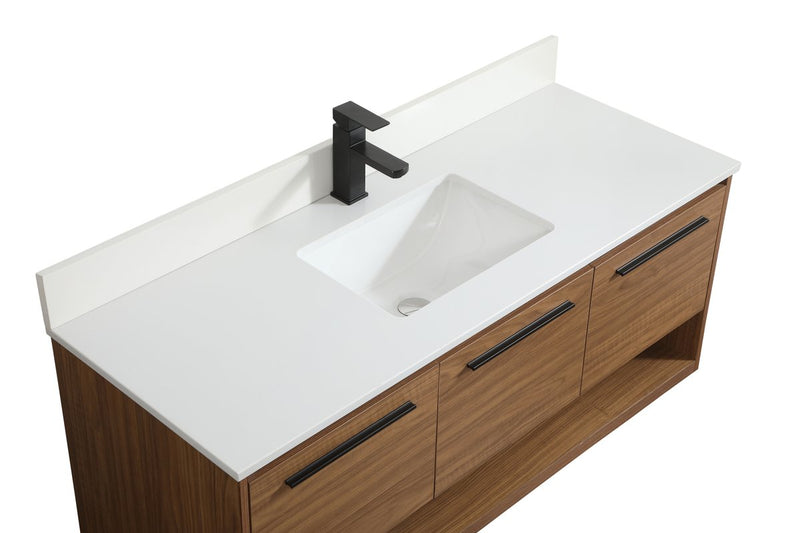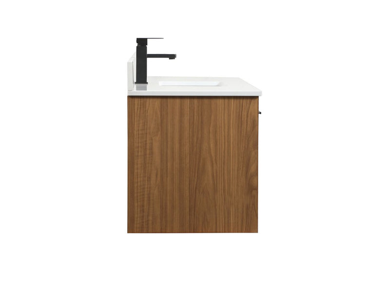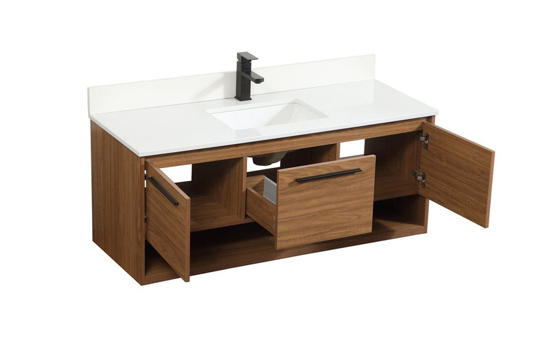Save space and make your bathroom appear bigger with this floating vanity. Its minimal design will have you in awe, while its clean lines will leave your room feeling fresh and uncluttered. The single u-drawer pulls out for storage while the open space below allows you to place extra towels or various other essentials. The ivory white quartz counter top with porcelain sink adds refined luxe while the aluminum barpull style handle adorn the vanity face.