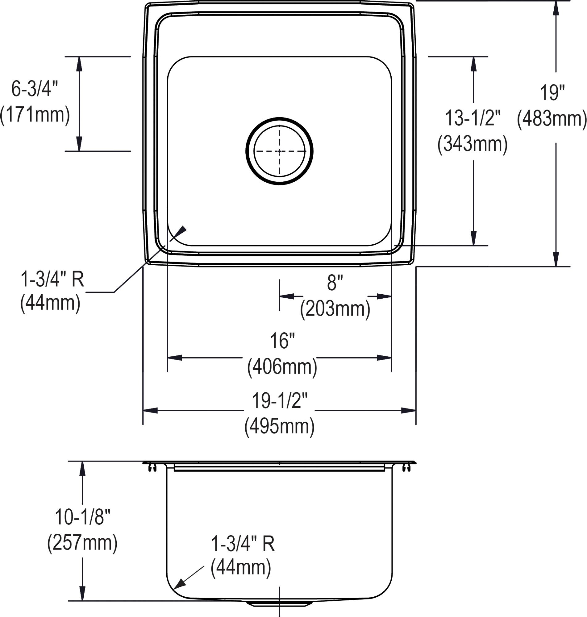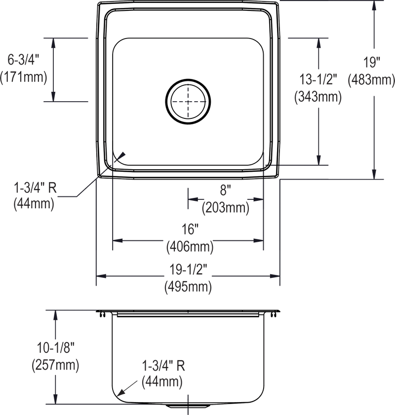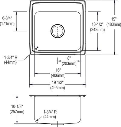- Sink Dimensions: 19-1/2" X 19" X 10-1/8" Min. Cabinet Size: 24"