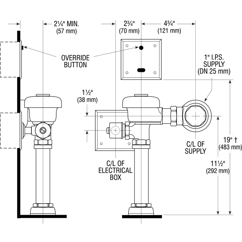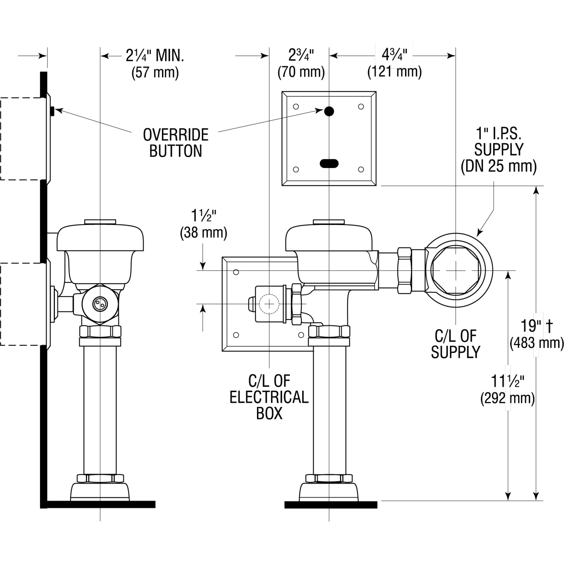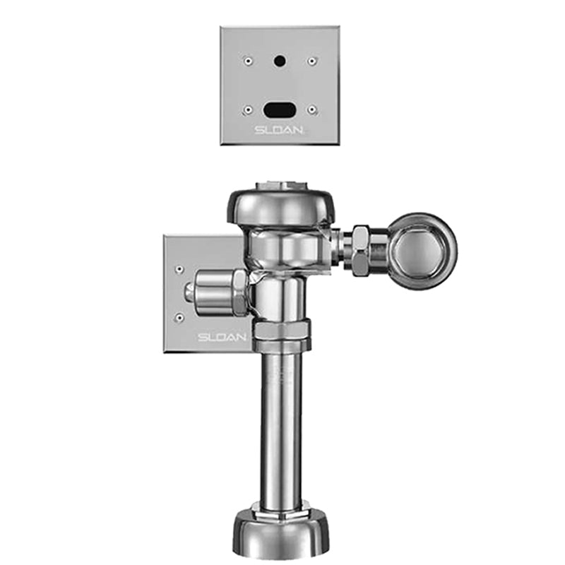 1.6 gpf, Polished Chrome Finish, Single Flush, Electrical Override, Hardwired, Sensor-Operated, Sloan Exposed Sensor Hardwired Water Closet Flushometer.