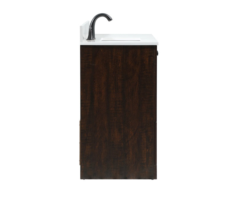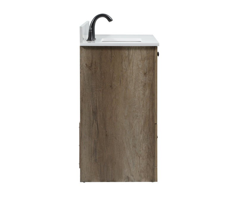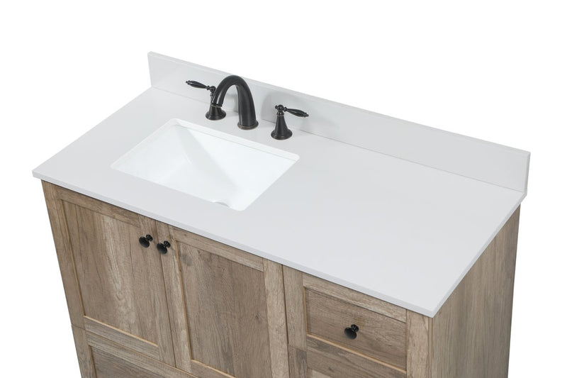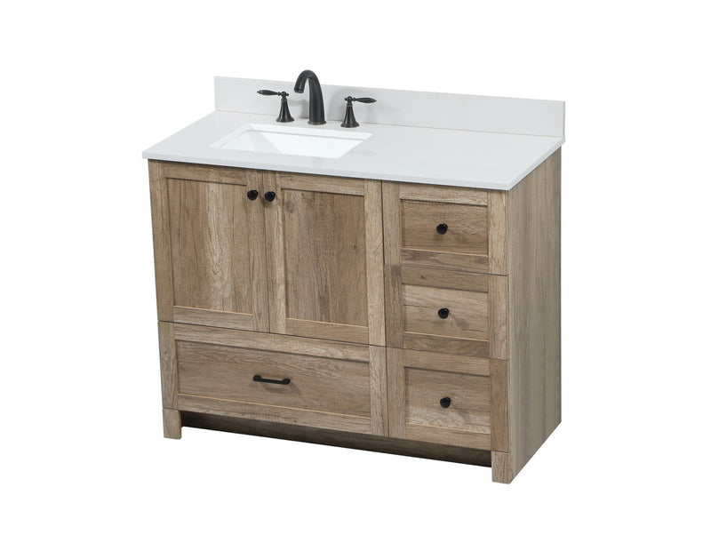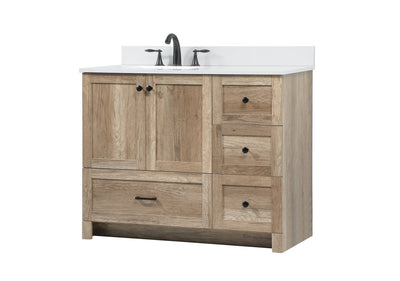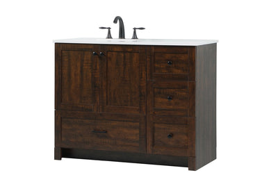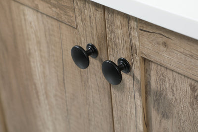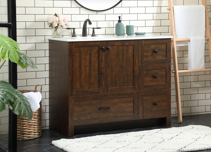 Delve into a world of minimalistic fashion and contemporary styling with this farmhouse 42" vanity. The clean faux lines anchors the weathered design. Black handle adorns the two doors hiding the base of the integrated porcelain sink while the bottom drawer and side drawers allow you to store your bathroom necessities and toiletries. It is the perfect vanity for any bathroom, regardless of size.