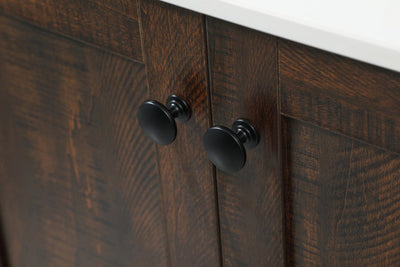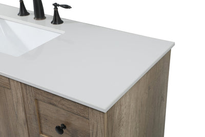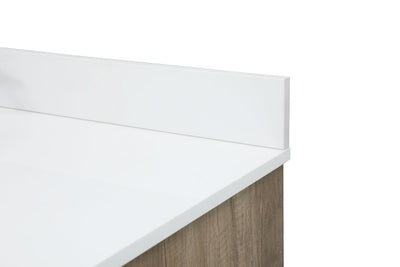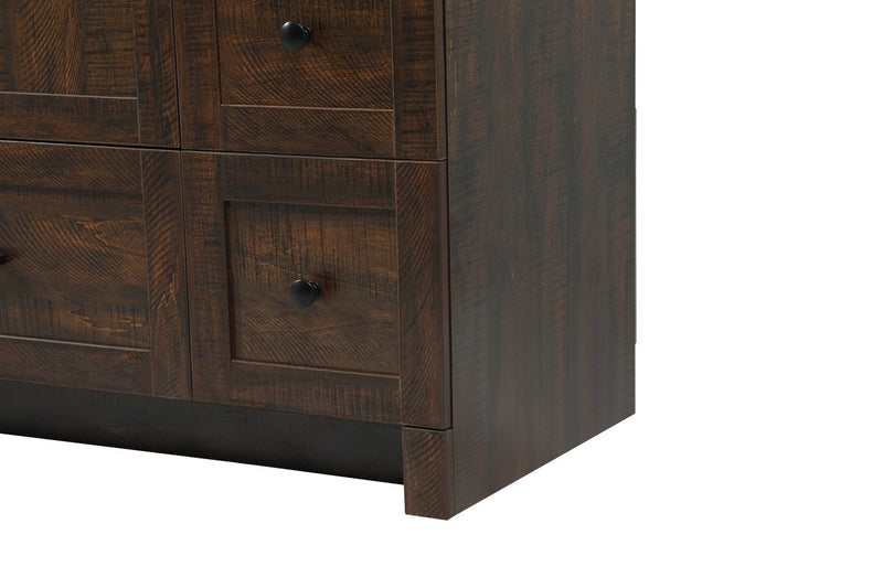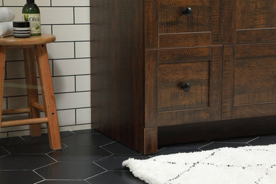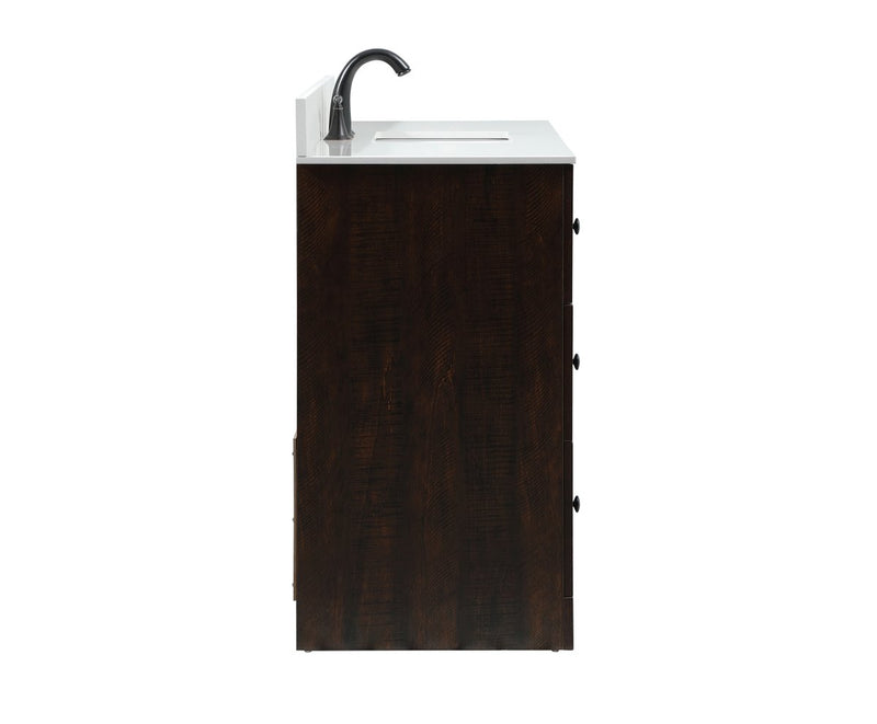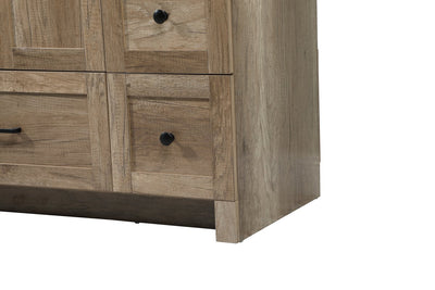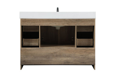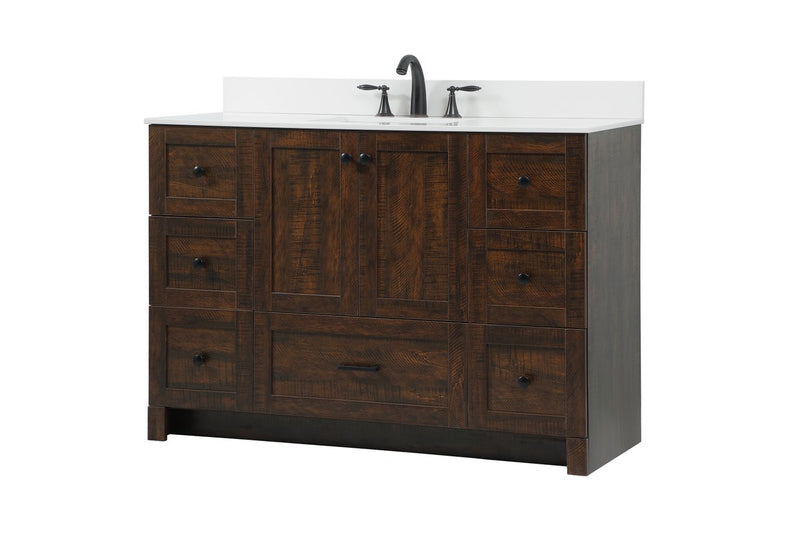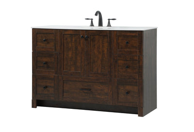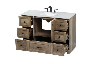 Delve into a world of minimalistic fashion and contemporary styling with this farmhouse 48" vanity. The clean faux lines anchors the weathered design. Black handle adorns the two doors hiding the base of the integrated porcelain sink while the bottom drawer and side drawers allow you to store your bathroom necessities and toiletries. It is the perfect vanity for any bathroom, regardless of size.
