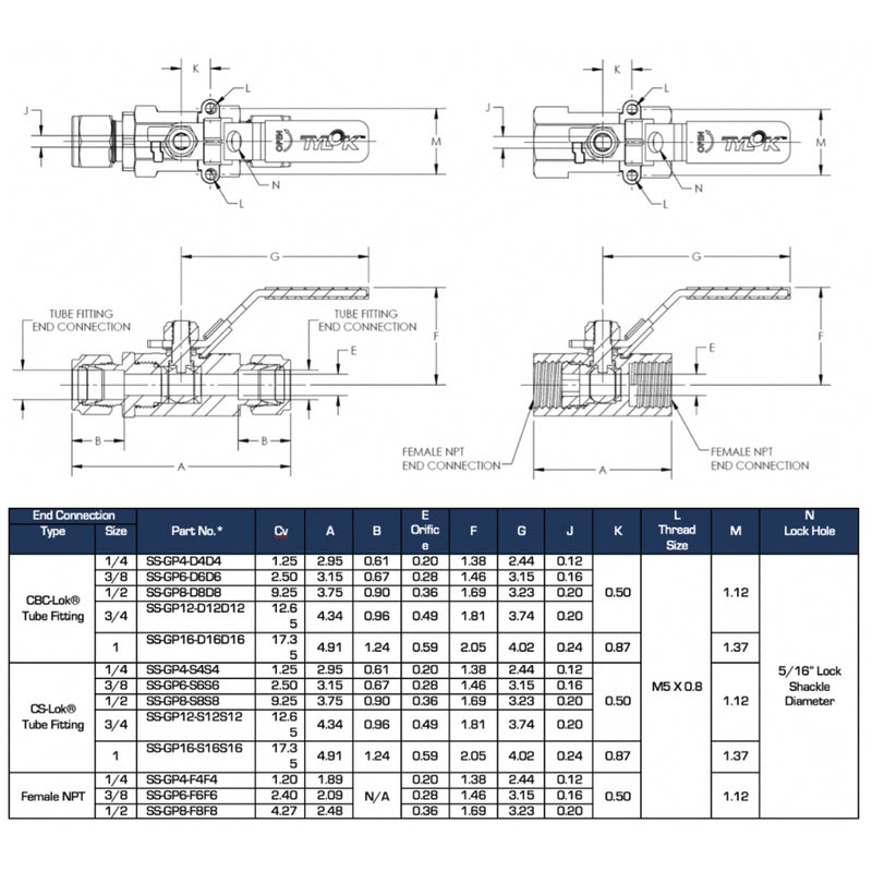 Tylok SS-GP8-D8D8 - Stainless GP Ball Valve 1/2" CBC Tube x 1/2" CBC Tube