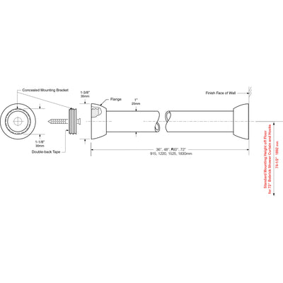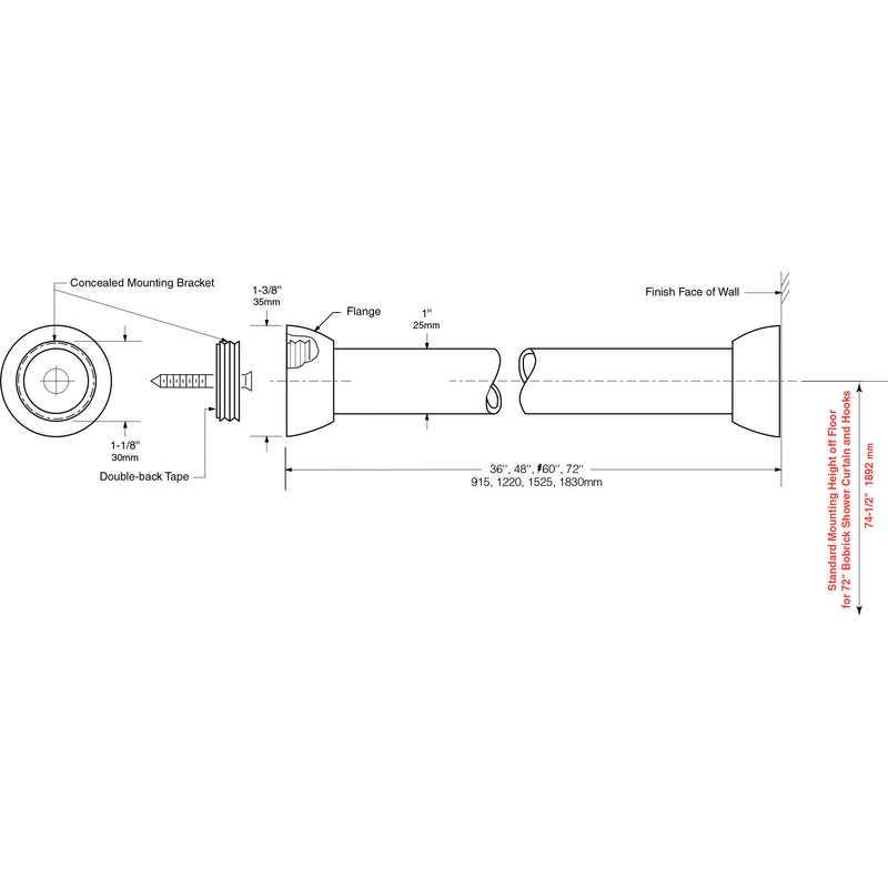 - Shower curtain rod shall be Type-304, 20-gauge (1.0mm) stainless steel with satin finish. It shall have an outside diameter of 1" (25mm). Flanges shall be 1-3/8" (35mm) diameter chrome-plated plastic with bright polished finish. Unit shall be equipped with concealed mounting brackets.
