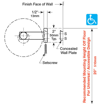 - Support-arm flanges lock to concealed stainless steel wall plate.