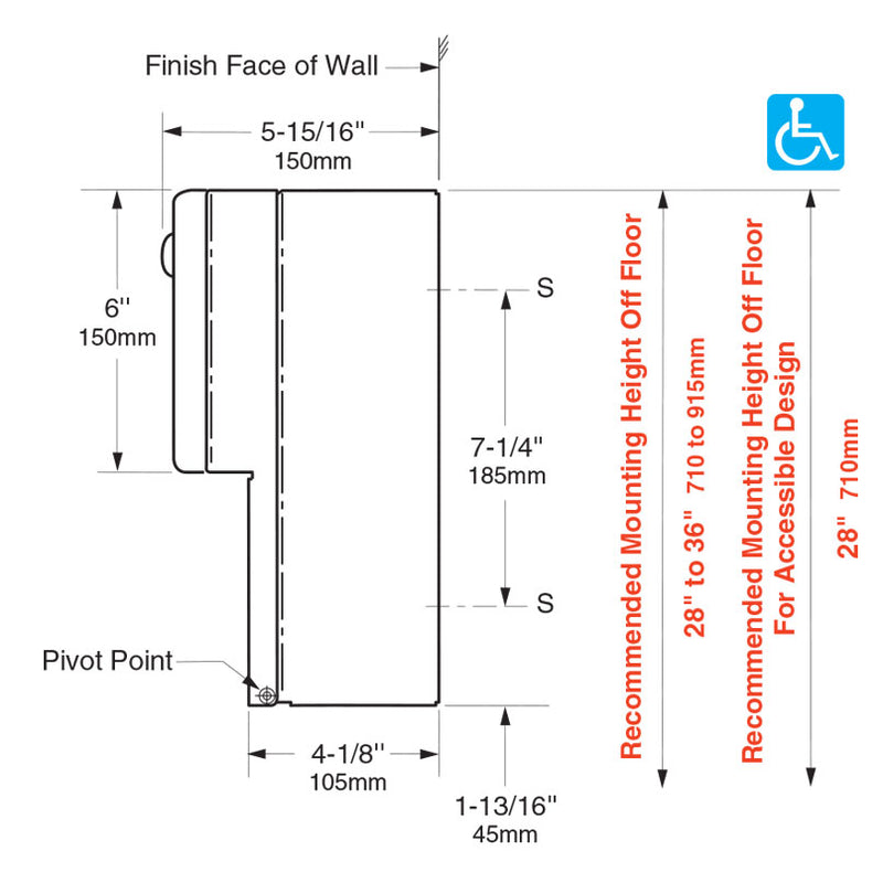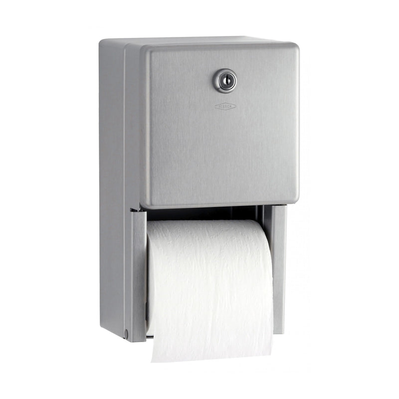 - Unit holds two standard-core toilet tissue rolls up to 5-1/4" (133mm) diameter (1800 sheets). Tissue rolls are loaded and locked into dispensing mechanism. Extra roll automatically drops in place when bottom roll is depleted. Depleted rolls can only be removed after unlocking door.