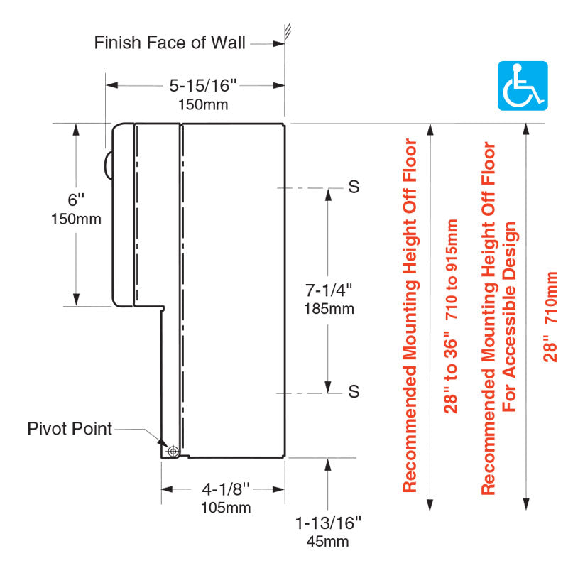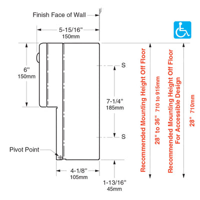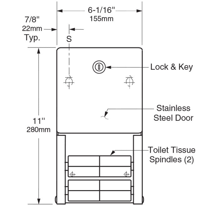 - Door — 18-8, type-304, 22-gauge (0.8mm) stainless steel with 18-gauge (1.2mm) stainless steel door frame. Exposed surfaces have satin finish. Front of door is drawn, one-piece, seamless construction. Secured to cabinet with two rivets. Equipped with a tumbler lock keyed like other Bobrick washroom accessories.
