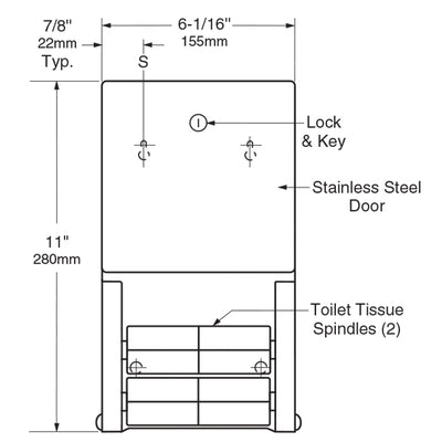 - Spindles (2) — Heavy-duty, one-piece, molded ABS. Theft-resistant. Retained in dispensing mechanism when door is locked.