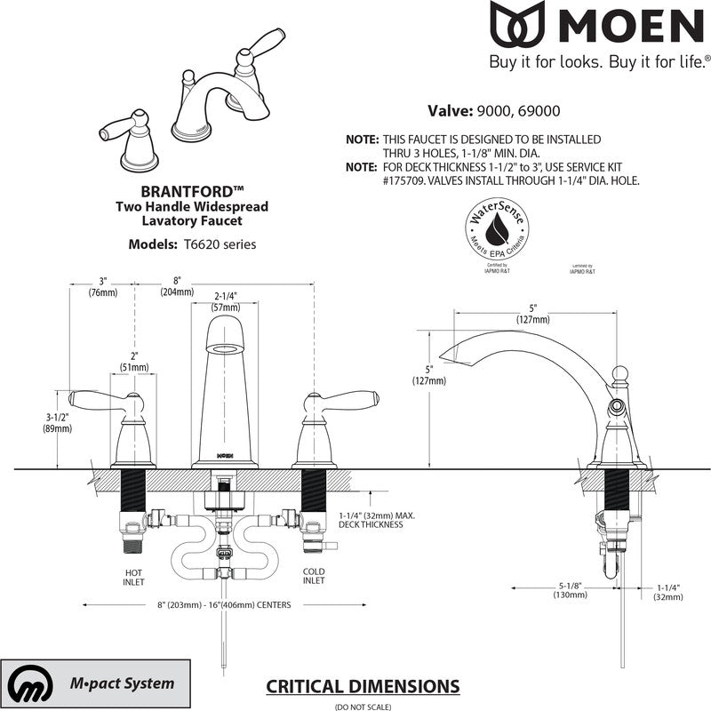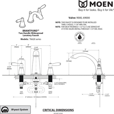 The Moen Brantford T6620BN is a refined two-handle widespread bathroom faucet with a graceful high-arc spout and a durable brushed nickel finish. Its classic styling and clean lines blend well with both traditional and transitional bathrooms. The included valve ensures a complete pairing for easy installation. With Moen’s commitment to quality and a lifetime finish warranty, this faucet combines elegance, performance, and long-term reliability.