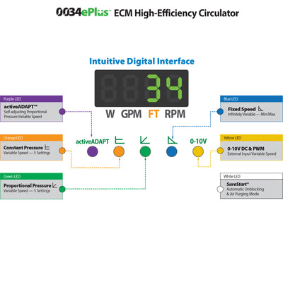 The 0034e & 0034ePlus ECM High-Efficiency Circulators are high-performance, variable speed, wet-rotor circulators with high-efficiency ECM permanent magnet technology. Their variable speed performance curves are equivalent to the Taco 009, 0010, 0011, 0012, 0012 3-Speed, 0013, 0013 3-Speed & 0014. Ideal for large residential and light commercial hydronic heating, chilled water cooling and domestic hot water systems. The ECM technology reduces power consumption by up to 85% compared to equivalent AC permanent split capacitor circulators. The 0034e comes with an easy-to-use dial while the 0034ePlus has an intuitive digital user interface.