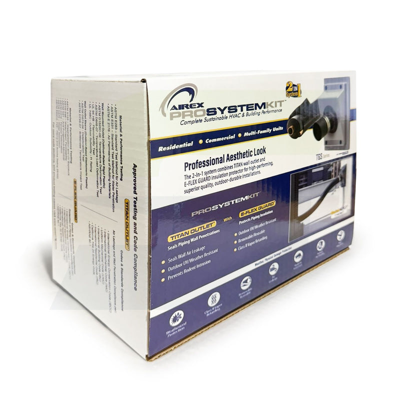 The Airex Pro-System Kit is a 2-In-1 system that combines air-tight sealing with a wall-mounted piping outlet and a UV/Vapor Retarder piping insulation protector for exterior applications of HVAC refrigerant piping wall penetrations and outdoor insulation.