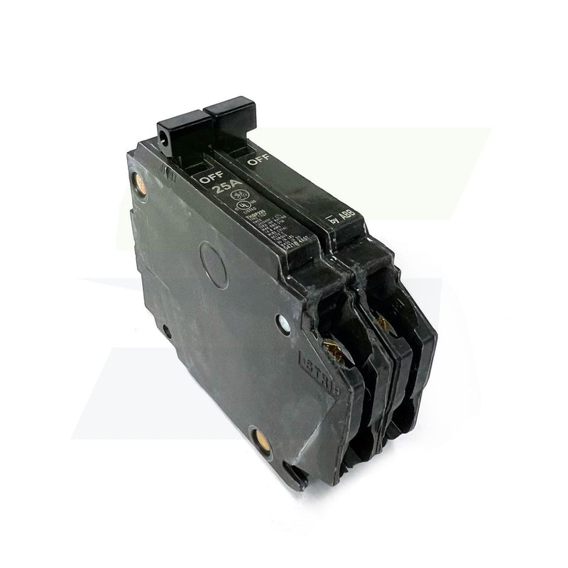 The ABB THQP225 is a 2-pole, 25 amp plug-in circuit breaker from the Thin Q-Line series, originally designed by GE. It's engineered for use in GE PowerMark load centers and ABB ReliaHome panels, providing reliable thermal-magnetic protection for 120/240V AC systems. This breaker features a compact design, allowing for efficient space utilization in electrical panels. It includes a quick-make/quick-break mechanism and a common trip bar for simultaneous disconnection in the event of an overload or short circuit.