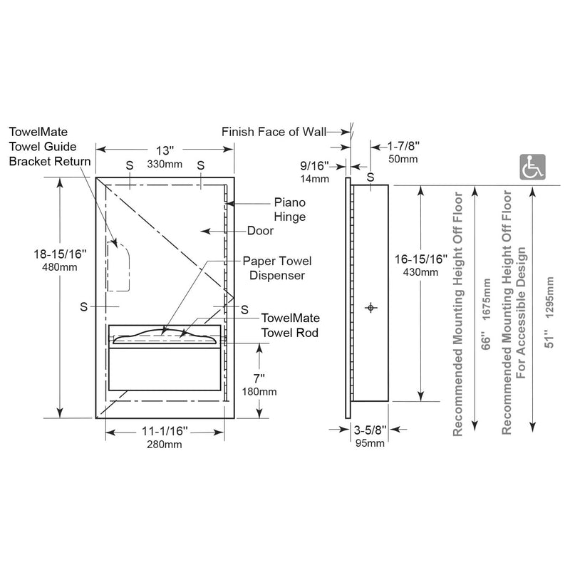- Paper Towel Dispenser — 18-8, type-304, 22-gauge (0.8mm) stainless steel. Capacity: 300 C-fold or 400 multifold paper towels. TowelMate consisting of a 90° return towel guide angle inside cabinet to prevent paper towels from falling forward out when door is opened for servicing TowelMate® Towel Rod Assembly — Consisting of a round Nylon Rod and (2) stainless steel Rod Screws for attachment, is field replaceable. Stainless steel Stop Screws (2) lock TowelMate Rod assembly in place. To retrofit TowelMate into existing installed units manufactured prior to Feb. 2021, order TowelMate Accessory Bobrick Model No. 369-130.