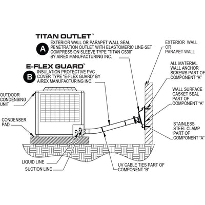 The Airex Pro-System Kit is a 2-In-1 system that combines air-tight sealing with a wall-mounted piping outlet and a UV/Vapor Retarder piping insulation protector for exterior applications of HVAC refrigerant piping wall penetrations and outdoor insulation.