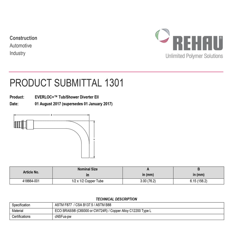 Rehau 418664-001 - Tub/Shower Diverter Ell, 1/2" EVERLOC+