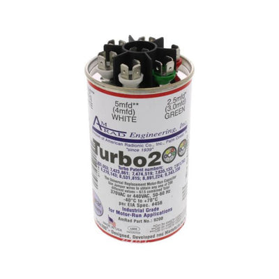 The Turbo200 motor-run capacitor has a capacitance range of 2.5 - 65.0 uF, and is rated for use up to 440V. Replaces more than 200 dual capacitors used for HVAC and maintenance work.